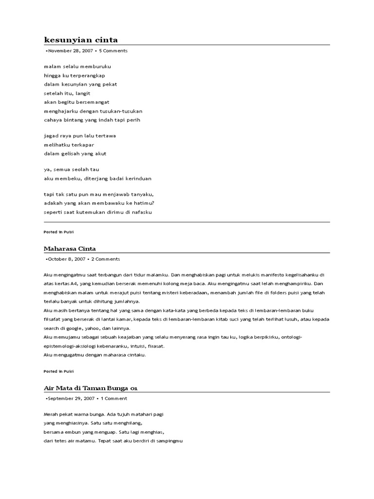 Doa yang terucap di lidahmu menceritakan tentang cinta di hatimu. Di sisi lain bayu sedang asyik dengan ponselnya entah apa yang sedang disibukkannya. Aku ingin kau rindukan, aku ingin kau kejar, aku ingin kau buatkan puisi. Kamu dengerin gih, apalagi yang lagi jatuh cinta! Andai aku diberikan waktu akan ku putarkan masa kembali biarpun mustahil diriku akan bersamamu di saat aku hanyut menjauh terkapai jatuh di lautan pilu ku agungkan tentang diriku buat kau kecewa biar apa terjadi biarkanlah ku tanggung sendiri kau bicara tentang cinta sedang aku hilang arah. Ini adalah kisahku pada waktu aku masih smp kelas tiga di kota kembang, waktu itu aku ada liburan di rumah kakekku di daerah lembang, disana dia tinggal dirumah kakekku karena rumahnya sedang dibangun di daerah bogor sedang suaminya (adik ayahku) tinggal di kost dan pulang seminggu sekali. Disaat aku hanyut menjauh terkapai jatuh dilautan pilu ku agungkan tentang diriku buat kau kecewa. Jika harus memilih, aku lebih rela memilih untuk tidak mengenalmu daripada aku harus melupakanmu… Gm f d# sedang aku hilang arah. Kita sedang bicara tentang gadis2 panggilan, dan kau bicara tentang bubur kepiting! Jangan hanya mengeluhkan kurang baiknya orang yang kau cintai, tapi utamakanlah membaikkan diri agar. Berikut ini aku ingin berbagi pengalaman tentang hubunganku dengan adik kandungku sendiri. Ternyata hanya kau harus aku cintai.