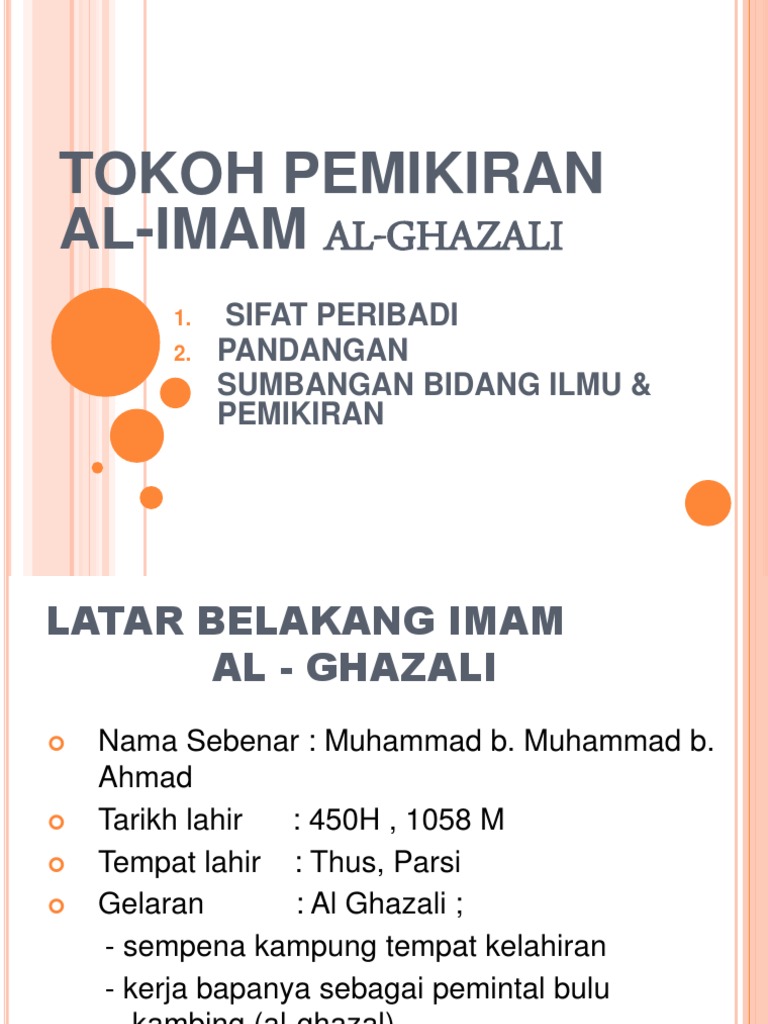 Al Ghazali Pptx Powerpoint from static.fdokumen.site Beliau merupakan seorang berketurunan parsi dan hidup di sekitar masa berlakunya perang salib. Terdapat evolusi yang berlaku pada matawang bermula daripada wang komoditi. Kebahagiaan hakiki ini hanya akan dicapai Ketokohan beliau telah memberikan kesan yang amat mendalam kepada jiwa kaum muslimin dari segi pemikiran dan juga budi pekerti. Dilahirkan pada tahun 450 hijrah bersamaan 1058 masihi dan dikenali sebagai al ghazali bersempena dengan nama kampung kelahirannya ghazala. Beliau dilahirkan di tusia, sebuah kota yang terletak di khurasan pada tahun 450 hijrah bersamaan 1058 masihi. Sumbangan beliau dalam bidang falsafah menyebabkan beliau menjadi sangat terkenal dan masih lagi menjadi antara bapa falsafah yang terulung. √ beliau seorang yang tekun dalam menuntut dan mendalami ilmu pengetahuan sehingga berjaya menguasai pelbagai cabang ilmu seperti usuluddin, usul fiqh, mantik, membaca hikmah dan yang paling terkenal ialah bidang falsafah.